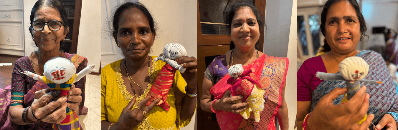 Our core team consists of Jaimala Iyer (Jaya)- She is a theatre facilitator, and has led many movements across marginalised groups, Girija Hariharan, muralist and social worker, theatre of the oppressed co-facilitator, Neethu, facilitator and Theatre of the Oppressed core trainer and sustainability coach, Anil Jha, ceramic artist, lyrical pottery and Theatre of the the oppressed co-facilitator. We have been working with Gurupriya Atreya, singer and Art for Inclusion practitioner. We launched initially with Kranti, an organisation that supports children of sex workers, and Save the Child foundation, USA.